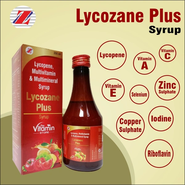 Lycozane Plus Syrup is a comprehensive multivitamin and antioxidant tonic designed to support immunity, skin, eye, and overall health. It is enriched with Lycopene, Vitamin A, Vitamin C, Vitamin D3, Vitamin E, B12, Zinc, Copper, Niacinamide, and Folic Acid for complete nutritional support.