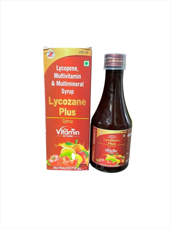 Lycozane Plus Syrup is a comprehensive multivitamin and antioxidant tonic designed to support immunity, skin, eye, and overall health. It is enriched with Lycopene, Vitamin A, Vitamin C, Vitamin D3, Vitamin E, B12, Zinc, Copper, Niacinamide, and Folic Acid for complete nutritional support.